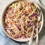 This easy coleslaw recipe is great for just about any occasion—a weeknight dinner, a summer BBQ, or a fun picnic lunch. Shredded cabbage and carrots create its colorful base, and a homemade coleslaw dressing ties the whole thing together. Crunchy, creamy, tangy, and lightly sweet, it’s one of my favorite quick side dishes. I’ve made it for countless cookouts over the last 6 years, and this creamy coleslaw recipe is always a hit!