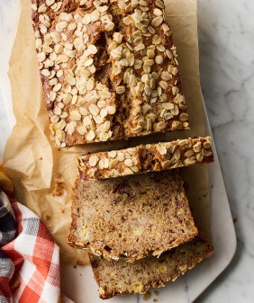Finally, bake! Pour the batter into the prepared loaf pan, and scatter more walnuts on top. I also like to add a sprinkle of whole rolled oats at this stage. Transfer the pan to the oven and bake for 42 to 48 minutes, or until a toothpick inserted into the center comes out mostly clean.
