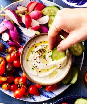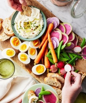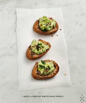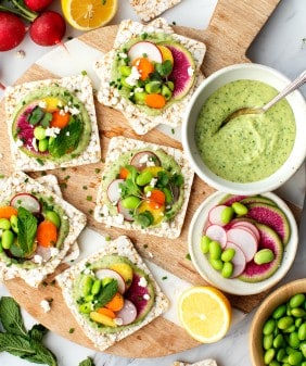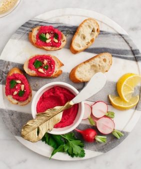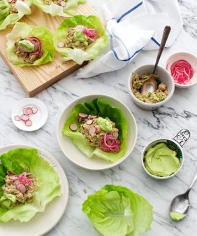 Edamame Hummus & Radish Crostini- Mushroom & Quinoa Lettuce Wraps