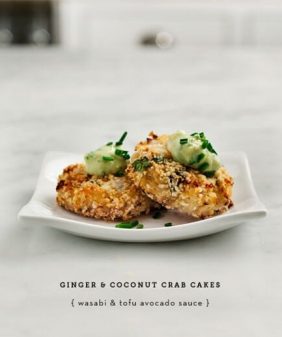 Basil White Bean Puree- Crab Cakes with Avocado-Wasabi Sauce