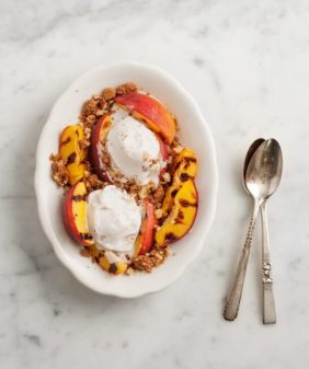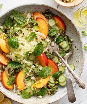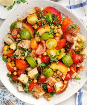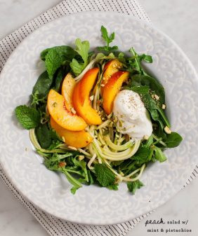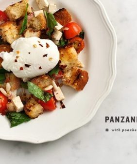 Grilled Peach Salad & Mint Pesto- Grilled Panzanella with Poached Egg