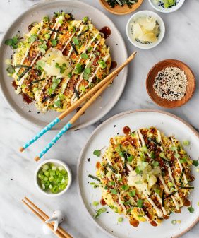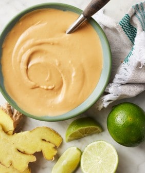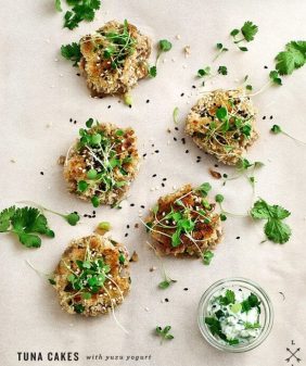 Tuna Cakes with Yuzu Yogurt- Ginger Noodles with Kale & Shiitakes