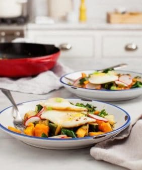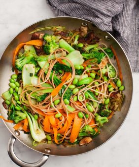Sweet Potato & Brussels Skillet- Ginger Citrus Soba & Snow Peas